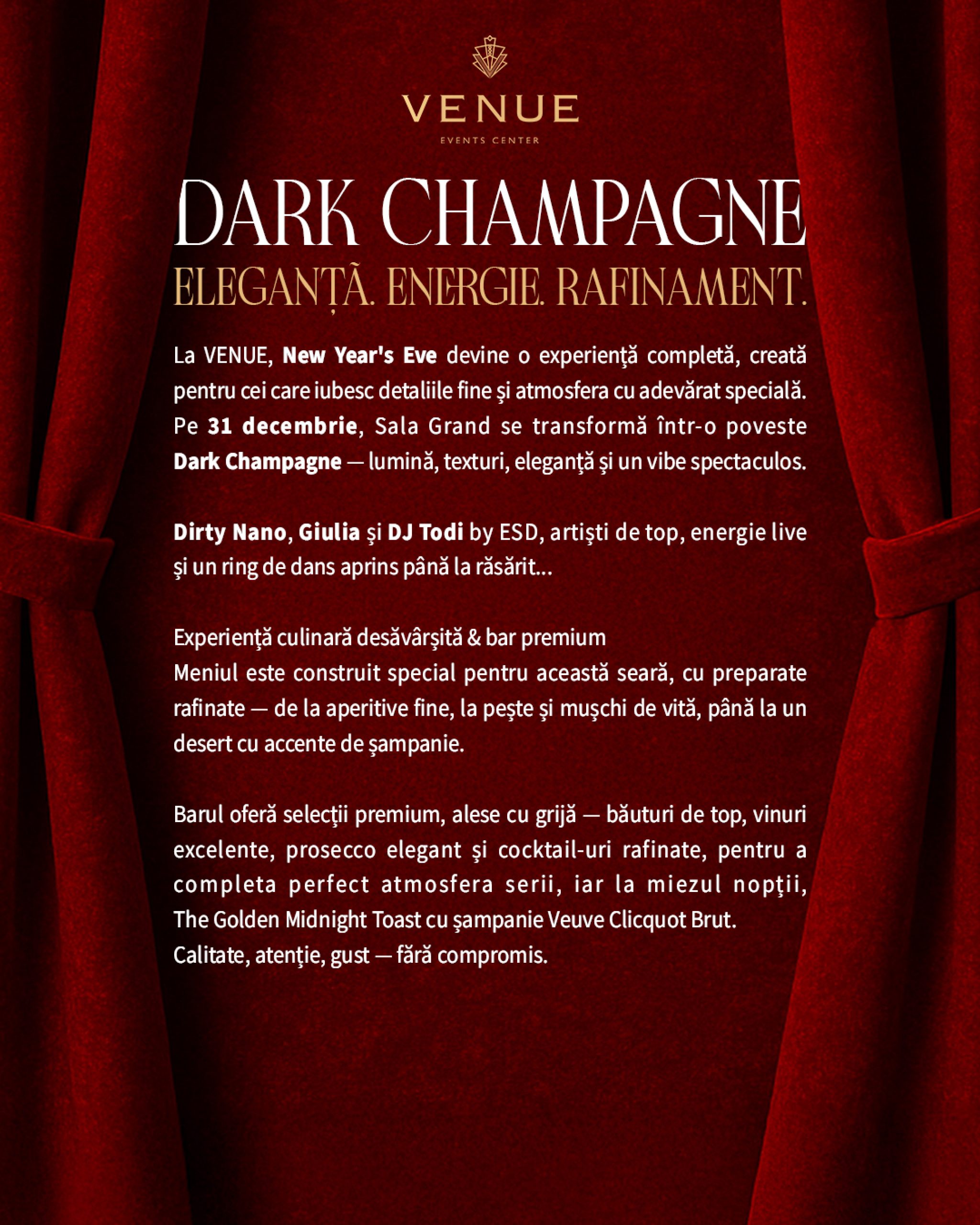 Pe 31 decembrie, Sala Grand se transformă într-o poveste Dark Champagne — lumină, texturi, eleganță și un vibe spectaculos.