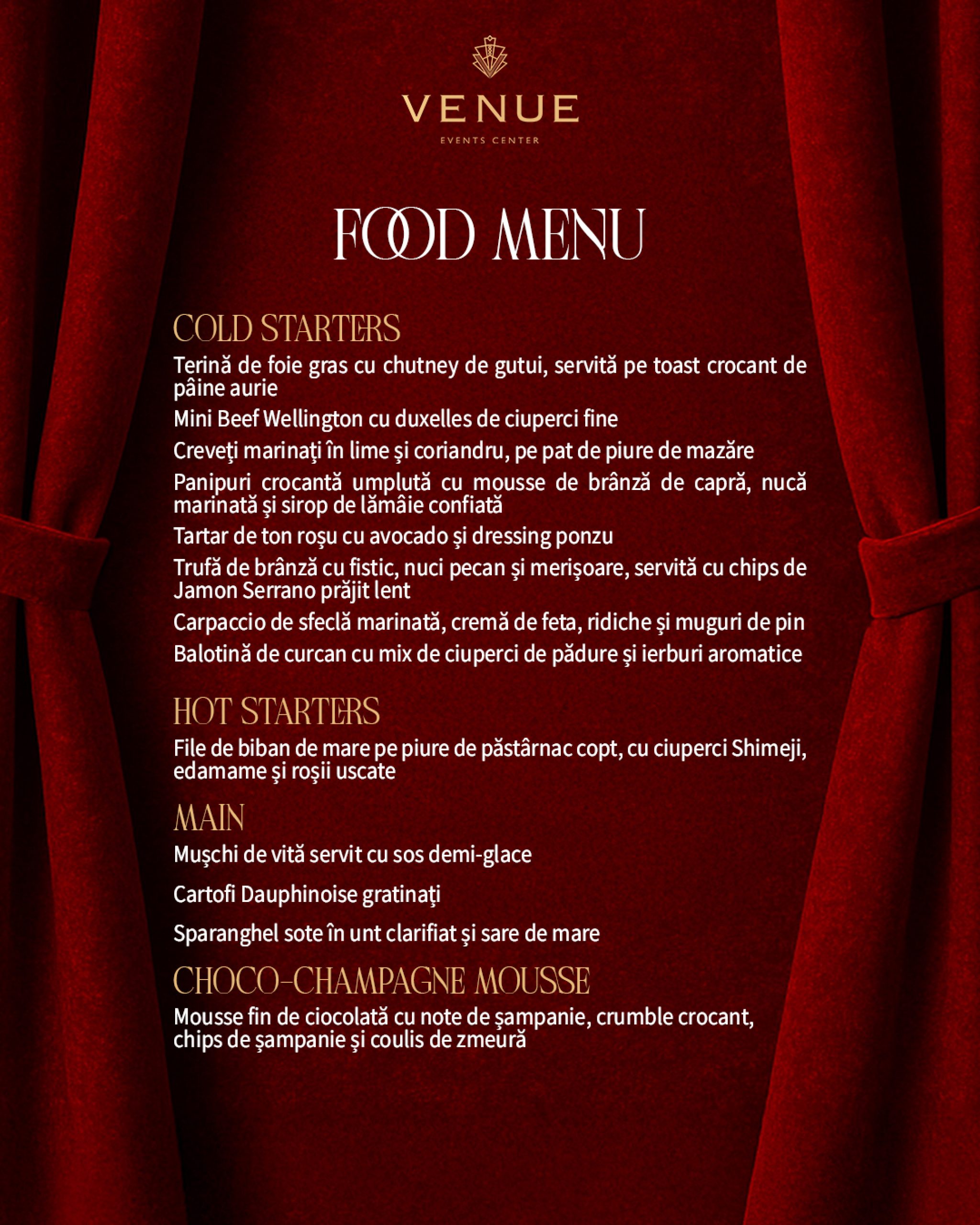 Meniul este construit special pentru această seară, cu preparate rafinate — de la aperitive fine, la pește și mușchi de vită, până la un desert cu accente de șampanie.