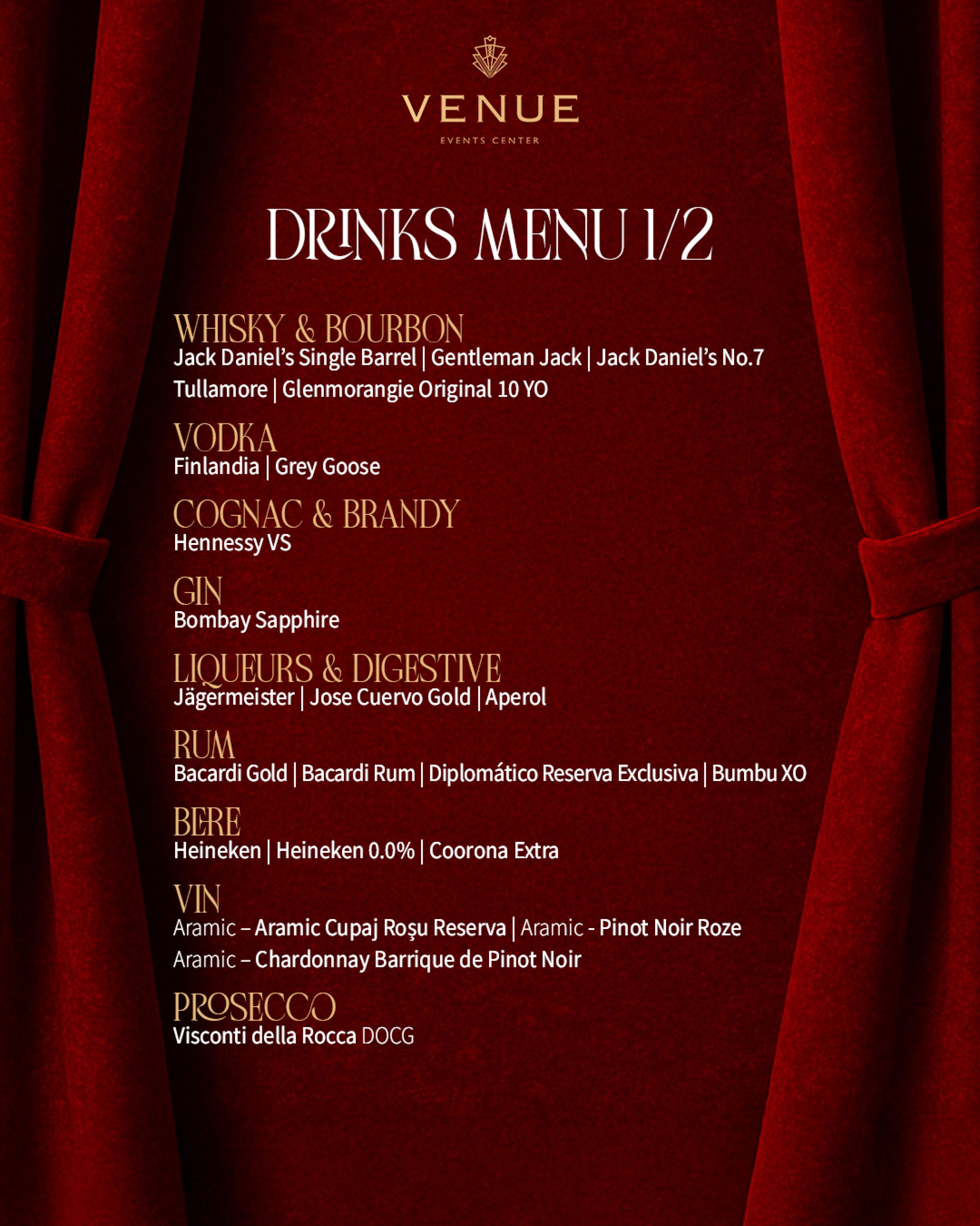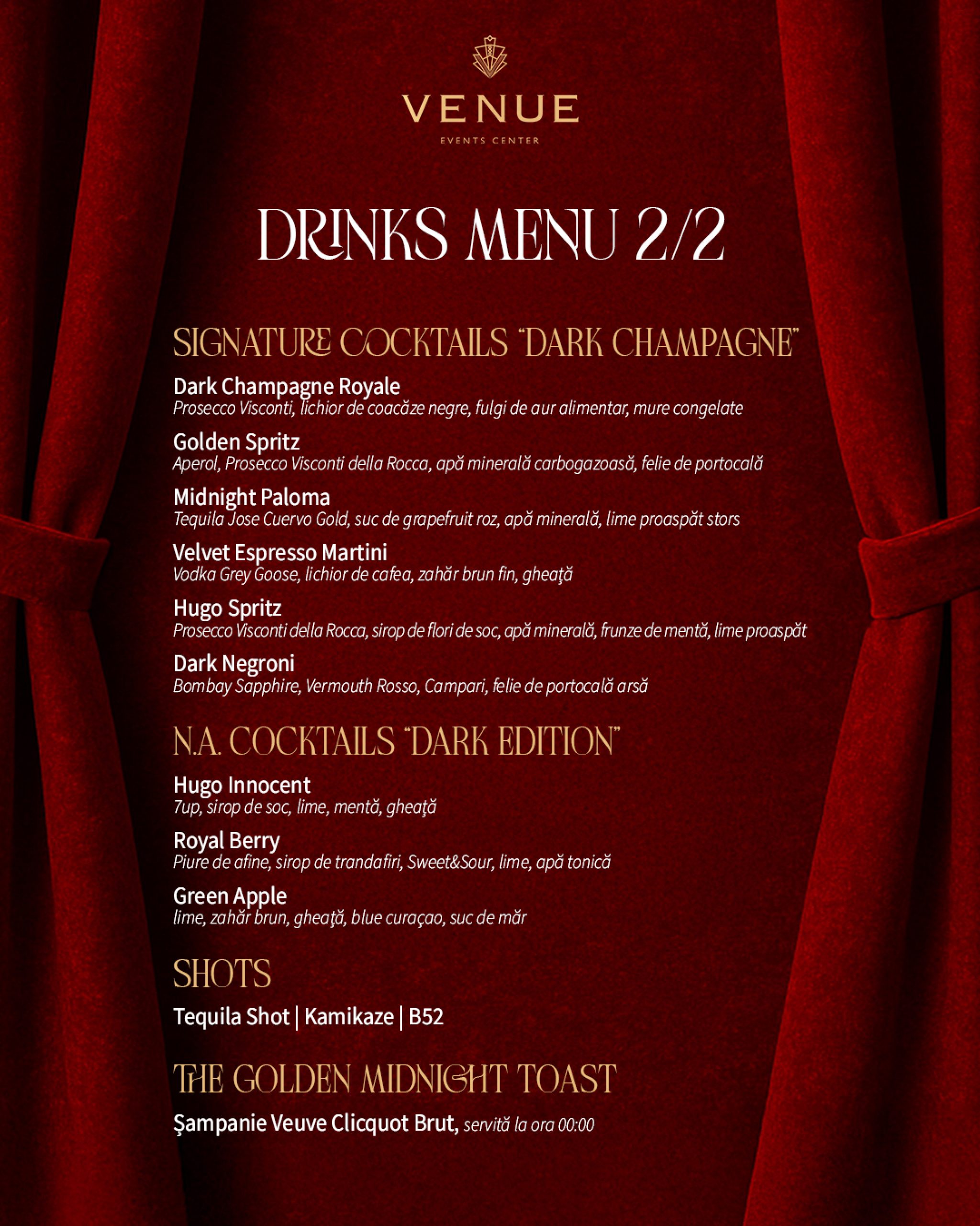 Barul oferă selecții premium, alese cu grijă — băuturi de top, vinuri excelente, prosecco elegant și cocktail-uri rafinate, pentru a completa perfect atmosfera serii, iar la miezul nopții, The Golden Midnight Toast cu șampanie Veuve Clicquot Brut.